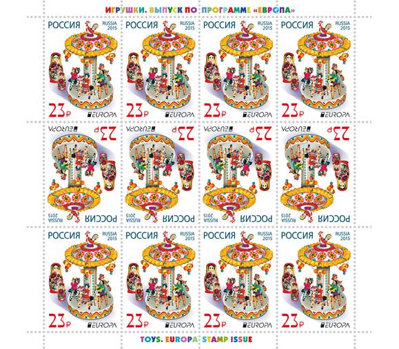Лист 2015 года. На листе размещено 12 марок (Тет-беш) одинакового сюжета. Обратите внимание: это первая марка России с изображением официального символа рубля.