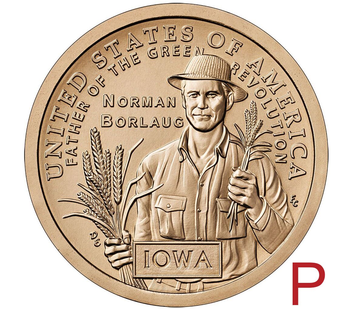 На оборотной стороне долларовой монеты из серии «Американские инновации», посвященной Айове, изображен доктор Норман Борлауг, держащий сноп пшеницы и колосья, что подчеркивает его новаторскую работу по разработке устойчивых сельскохозяйственных культур, способных прокормить растущее население планеты.